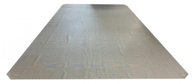 2mm thick, hard wearing, durable without being slippery. Laid on existing ground & pegged around sides. Follows ground contour.